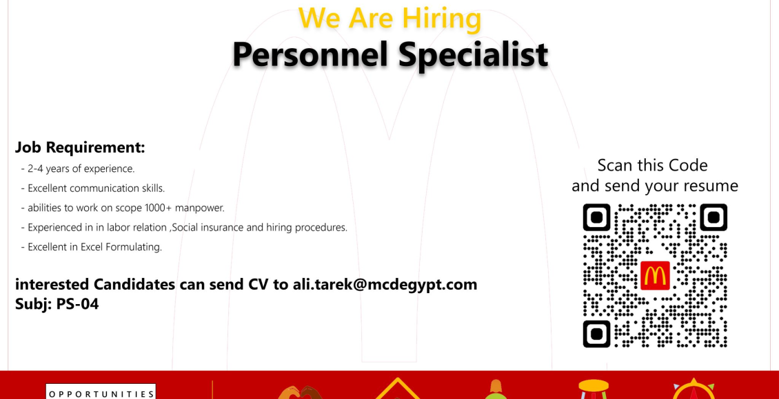 McDonalds Egypt is hiring for our Head Office in Zamalek Personnel Specialist.